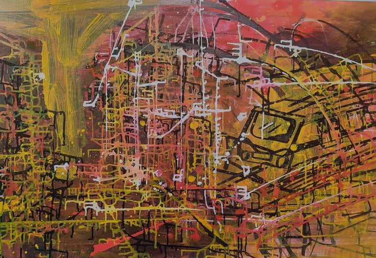 As pinturas a óleo de Rodrigo Pecci exploram estruturas urbanas fragmentadas, cores pulsantes e camadas de gestos que criam paisagens abstratas de forte intensidade visual. Seu estilo combina rigor gráfico e espontaneidade pictórica, resultando em obras complexas, vibrantes e profundamente contemporâneas. Cada tela revela sobreposições, linhas arquitetônicas e atmosferas cromáticas que evocam memória, cidade e movimento — consolidando Pecci como um pintor de linguagem singular na arte contemporânea brasileira.